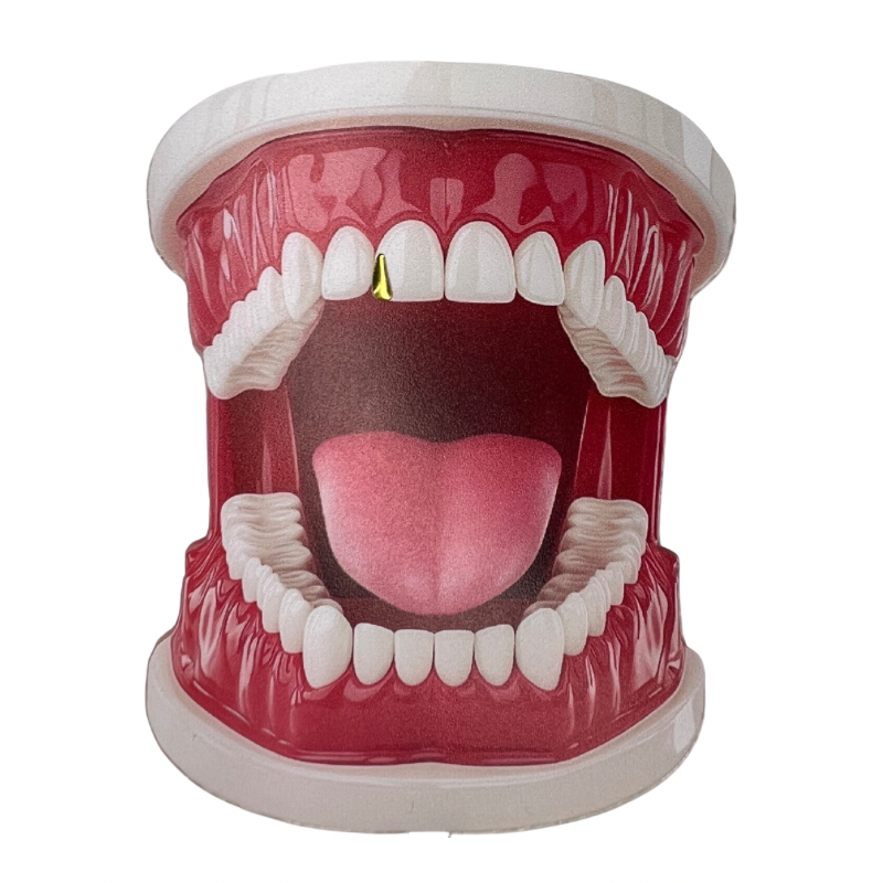 Dieser goldene Zahnschmuck hat die Form eines Zahns. Sie können es als Kontur für Ihre Zähne platzieren.