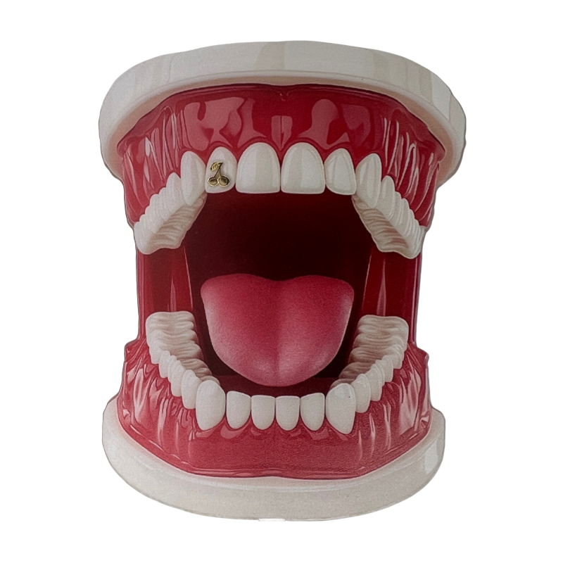 Add a touch of playfulness and glamour to your smile with this white gold cherry-shaped tooth gem.