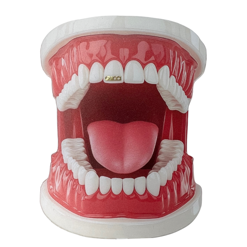 Gold Gucci logo Tooth Gem 18ct. Our goldies are dental toothgems to make your smile sparkle. Add some style to your smile with this famous fashion designer brand. Our gold tooth jewels are genuine gold and not gold plated. Only the best quality for our customers.