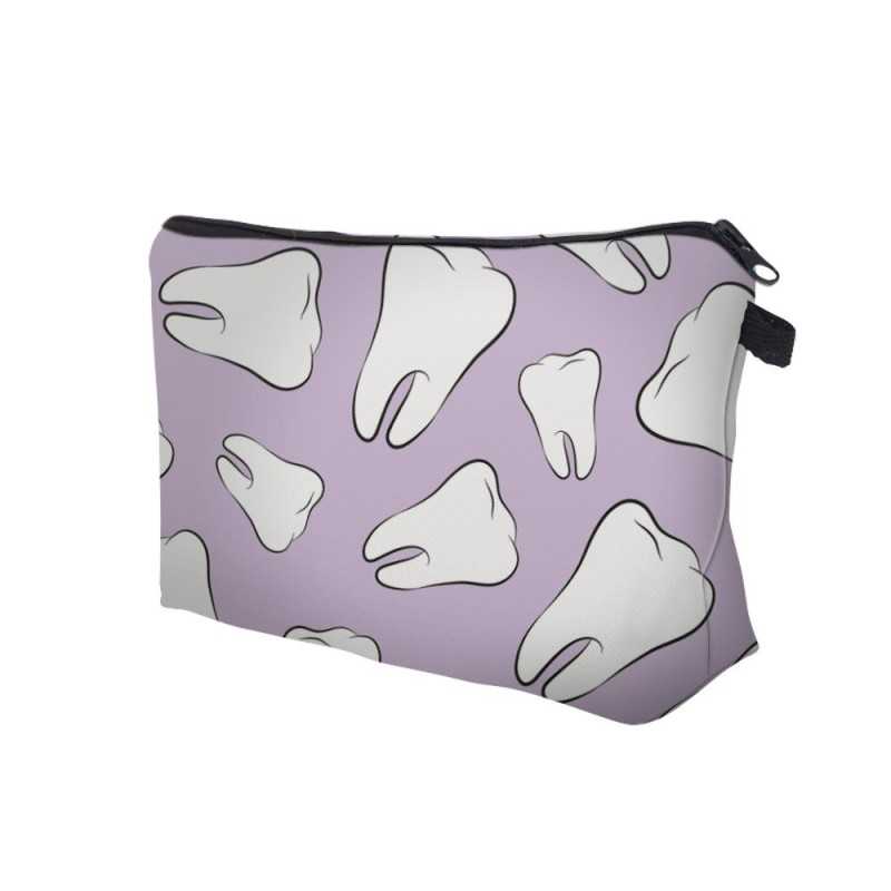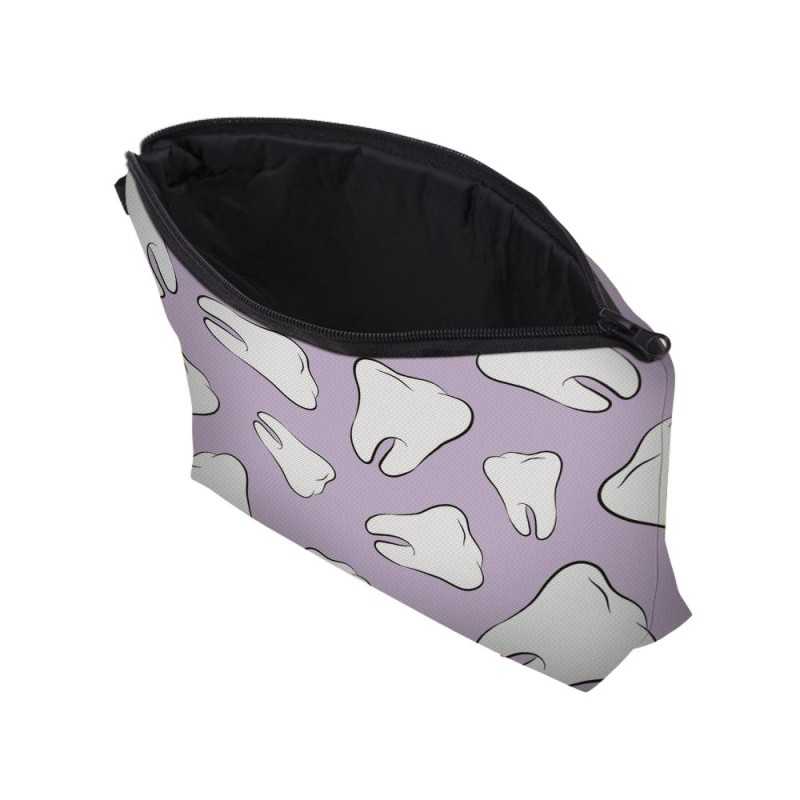 Lila make-up tasje met grappige tandenprint. Ideaal voor make-up, penselen of tooth gem accessoires.