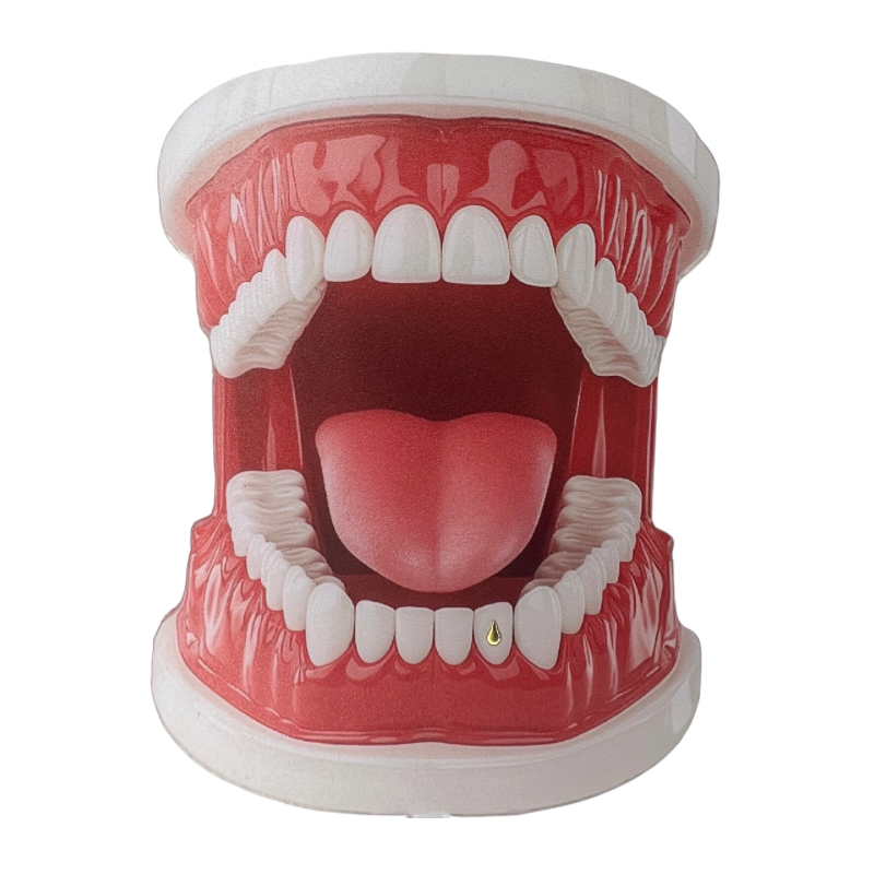 Deze drop tooth gem wordt vervaardigd uit 100% puur 22 karaats goud — geen plating of vergulding, maar écht massief goud.