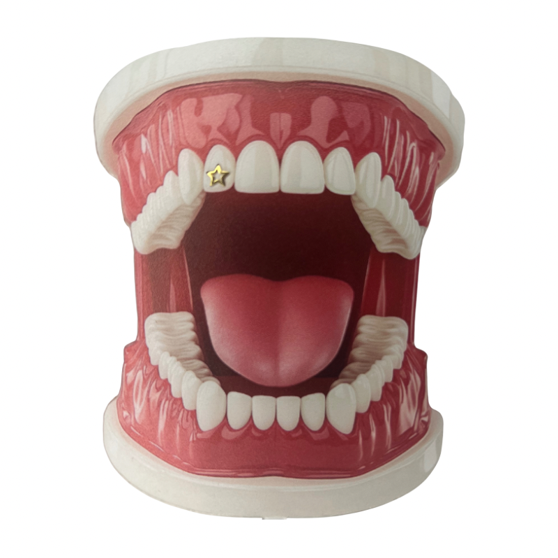 Met dit open ster gouden tandsieraad krijgt je glimlach een luchtige, verfijnde en luxueuze uitstraling.