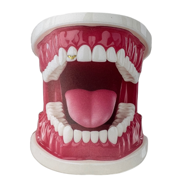 Dit gouden tandsieraad is in de vorm van een tand. Je kunt hem plaatsen als een contour voor je tanden.