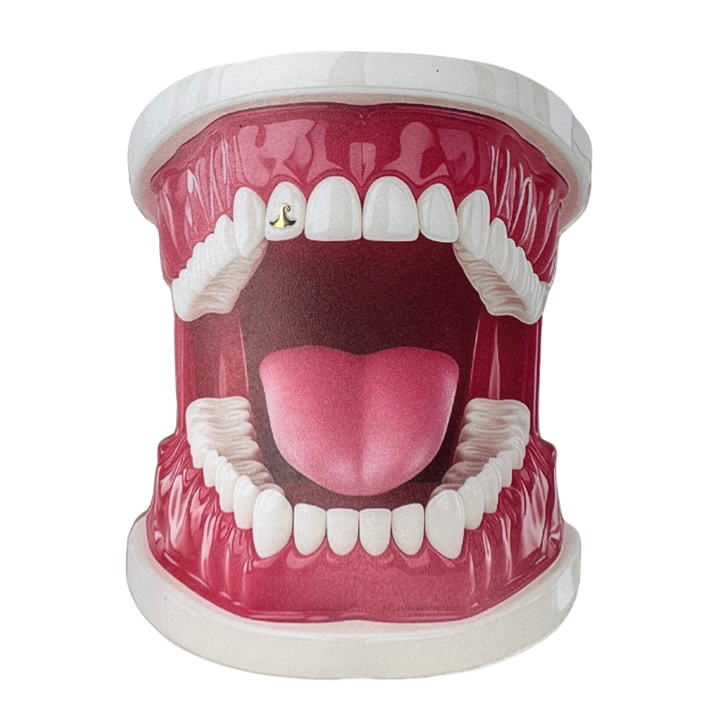 Dit heksenhoed tandsieraad geeft je smile een speels en opvallend accent dat direct de aandacht trekt.