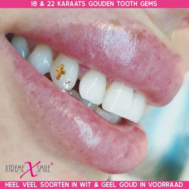 Laat je glimlach stralen met betekenis en stijl met dit gouden tandsieraad in de vorm van een kruis.